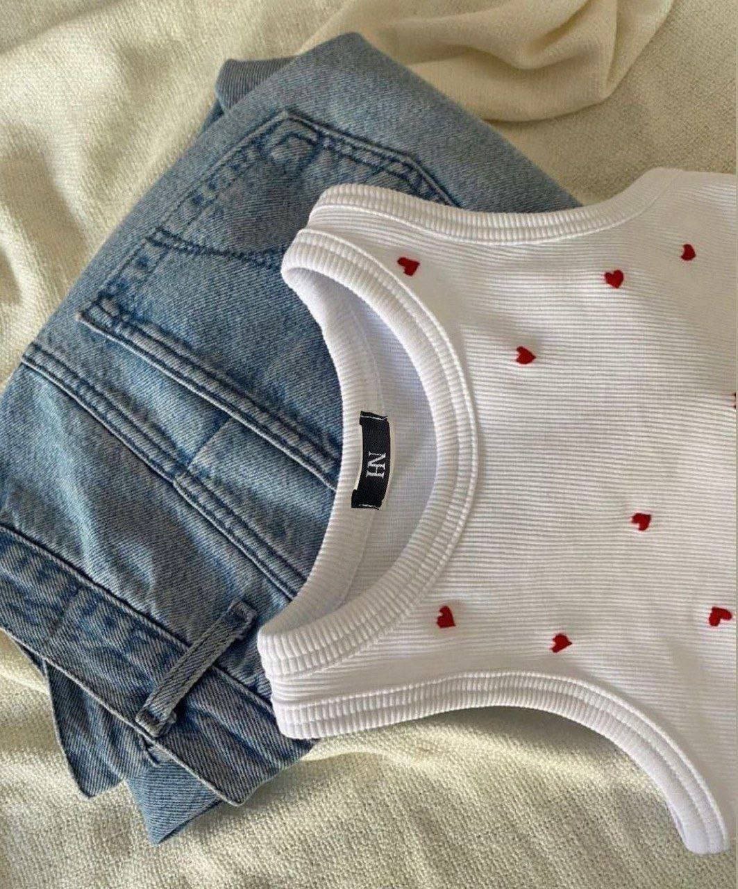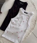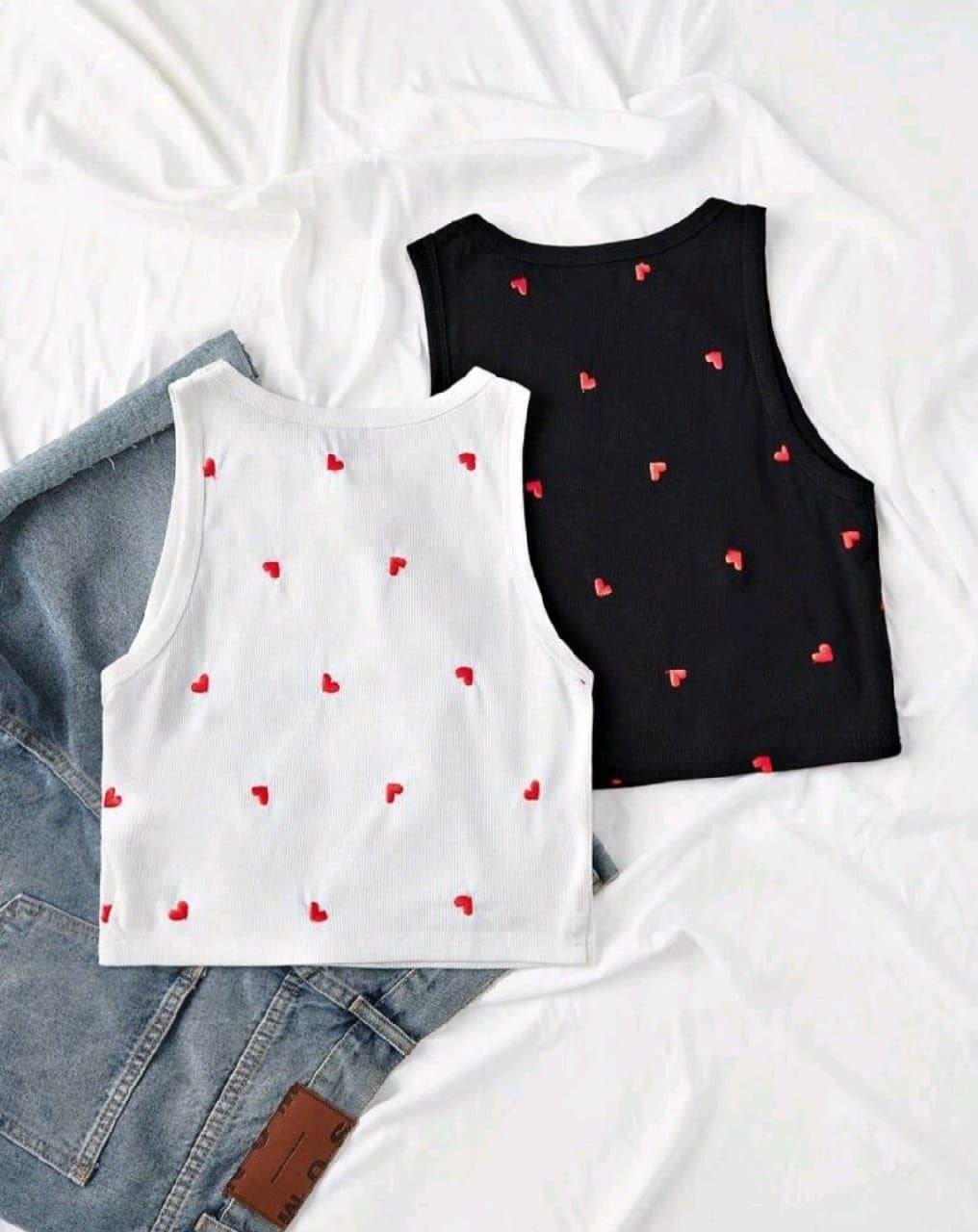 2. تطريز القلوب الصغيرة: ما يميز هذه القطعة هي القلوب الحمراء الصغيرة الموزعة بدقة، والتي تضيف لمسة من الحيوية والبهجة على اللون الأبيض الكلاسيكي.