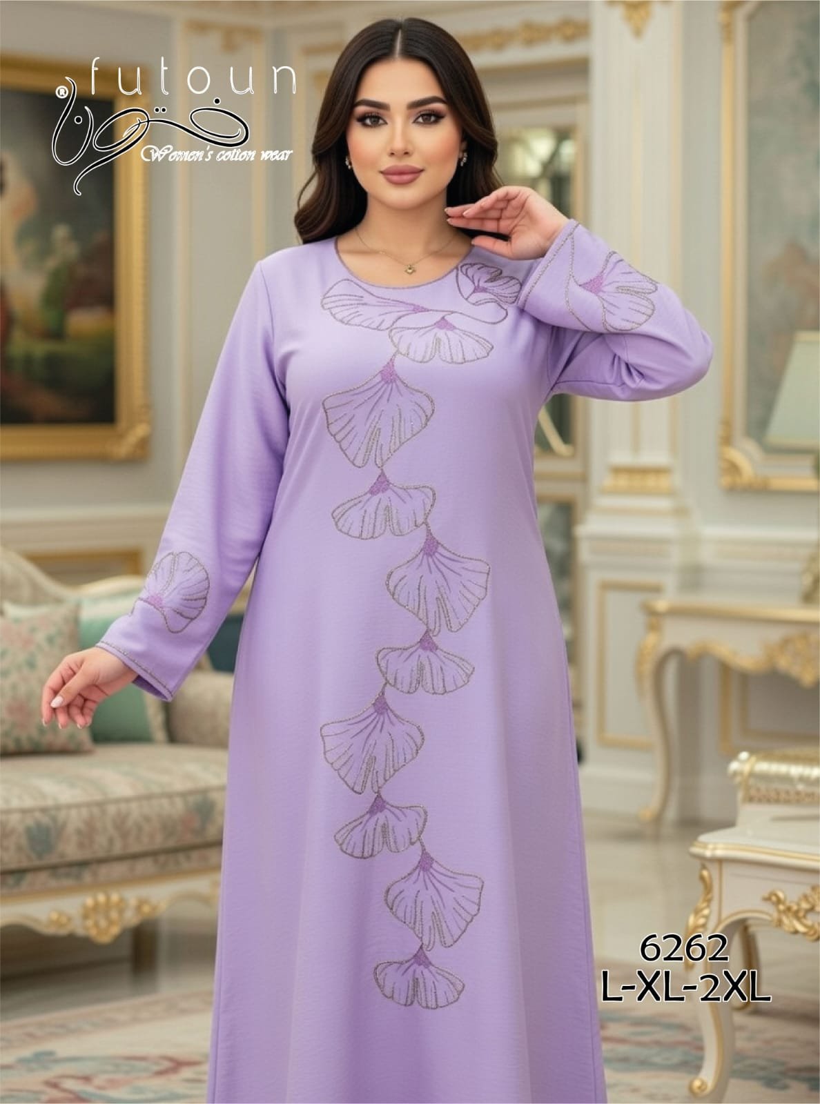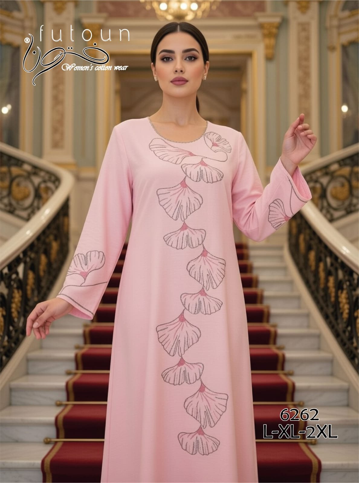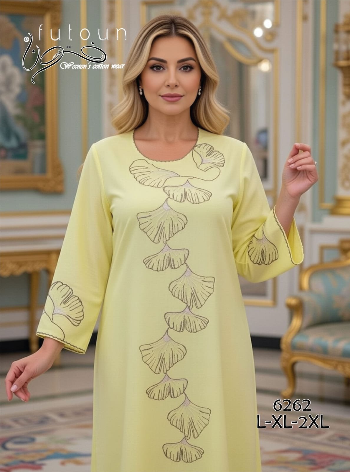 تطريز مبهج: رسمة أوراق الشجر الانسيابية بتدي للجسم شكل أرفع وأطول، مع لمعة خفيفة بتخطف العين.